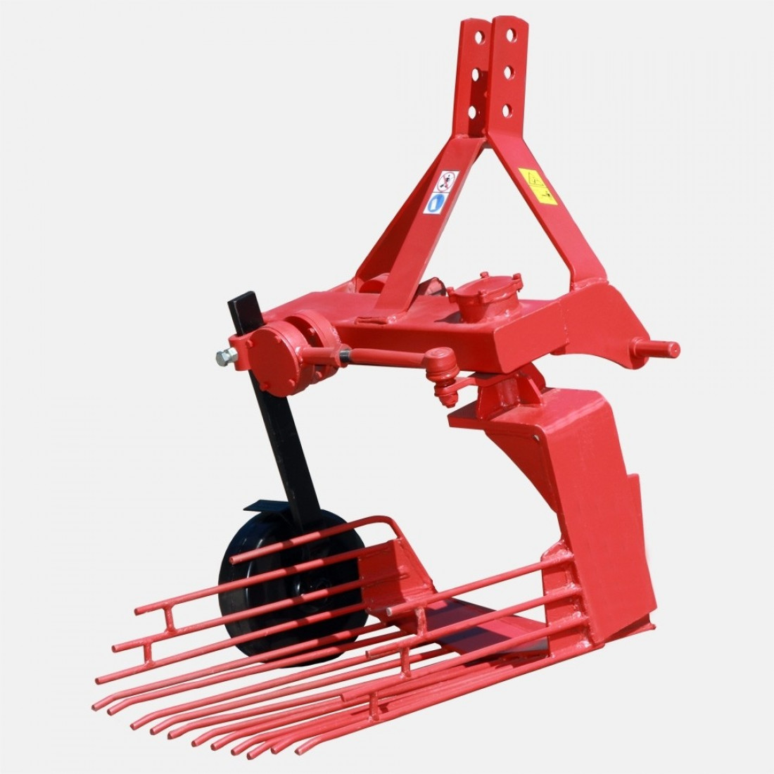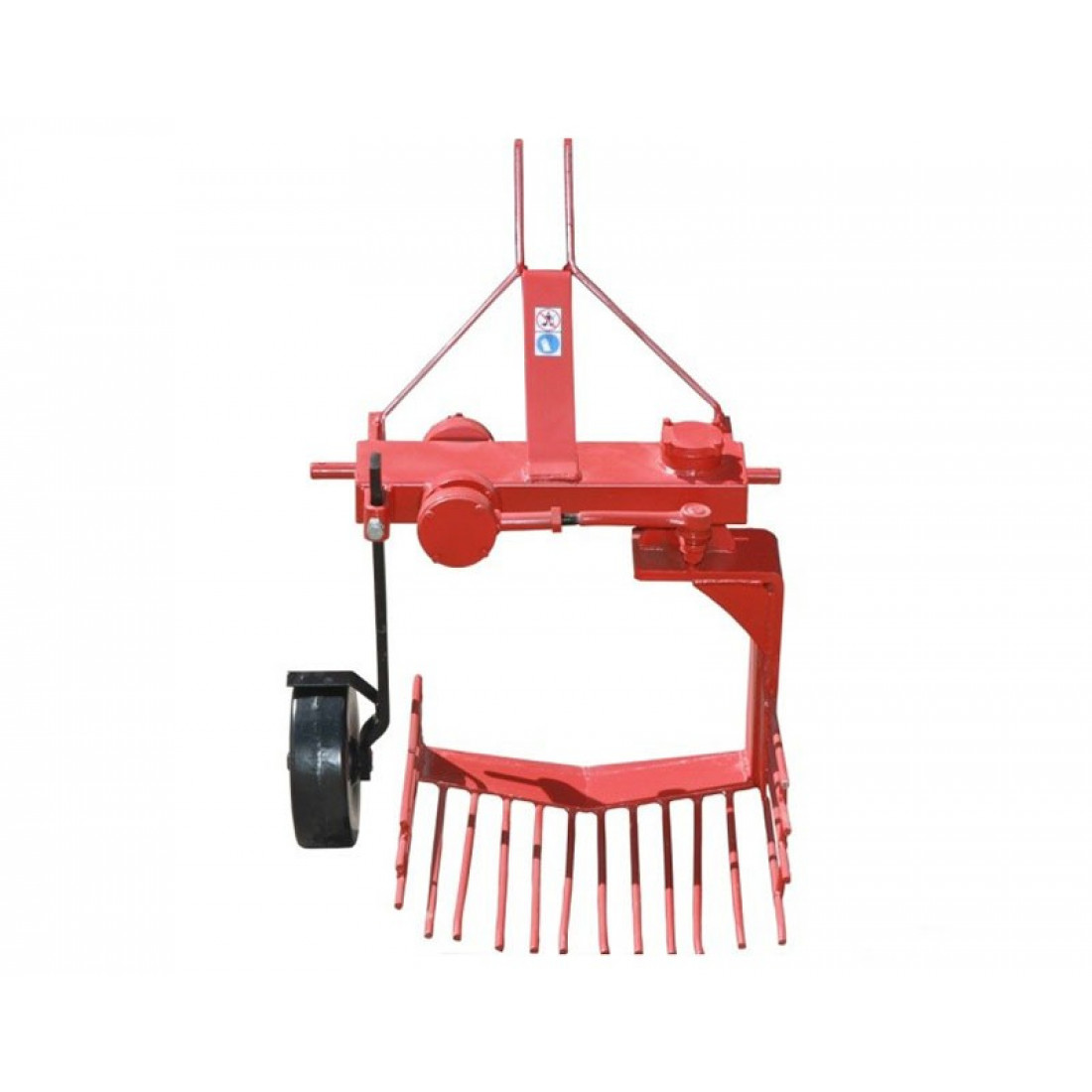 Передний массивный нож подрезает гребень на нужную глубину, которая составляет для этого устройства 20 см. При движении клубни перемещаются по пруткам, очищаясь от почвы.