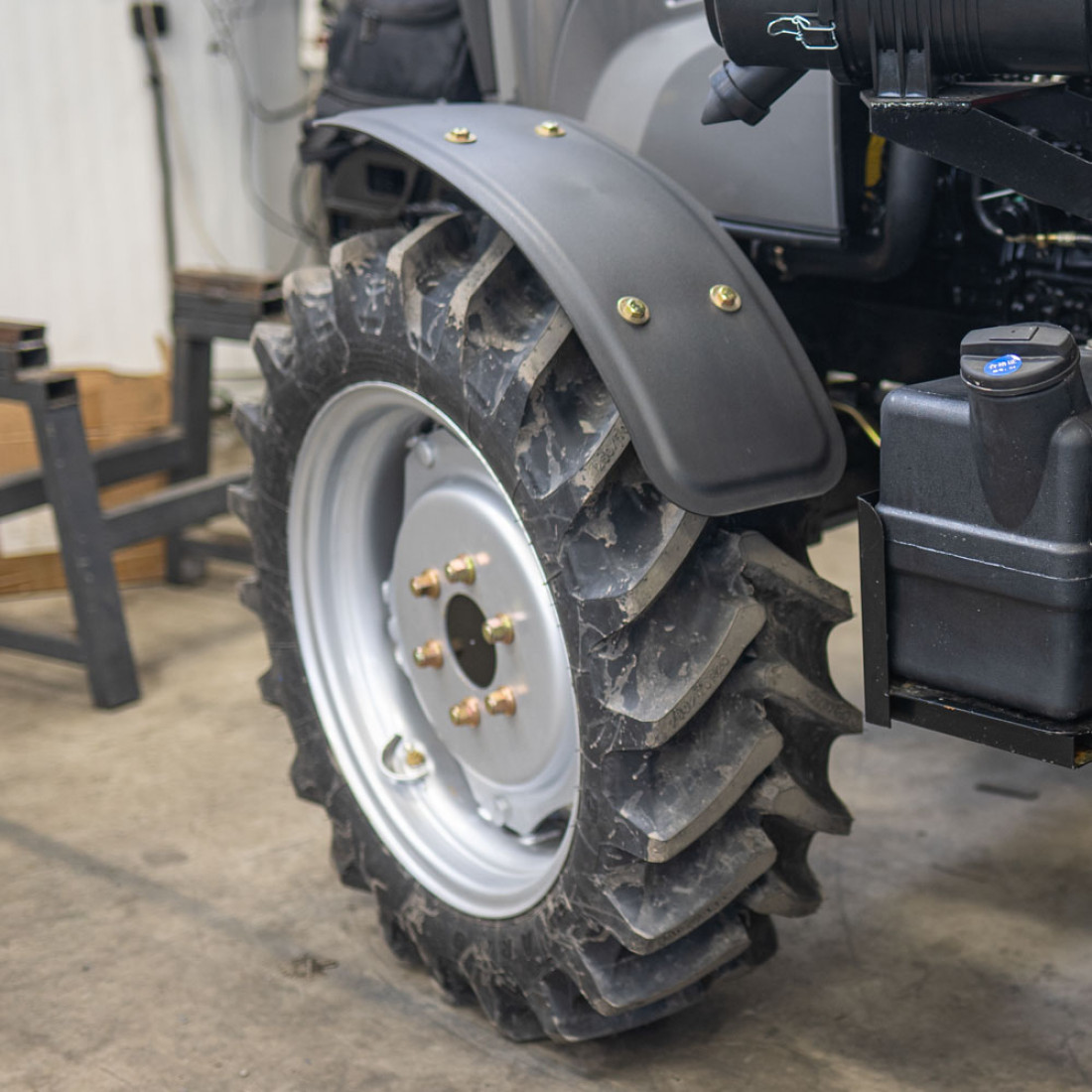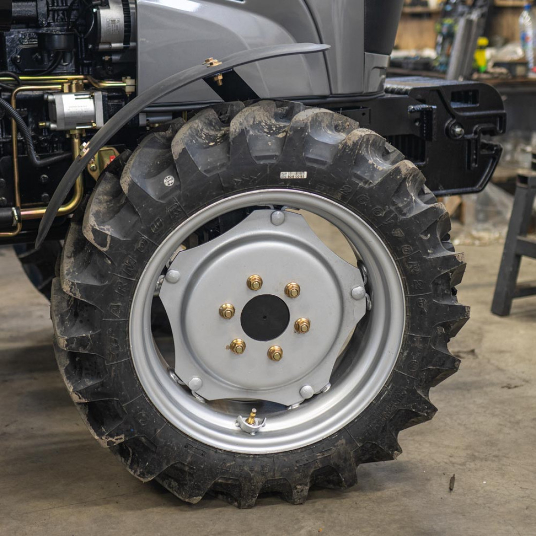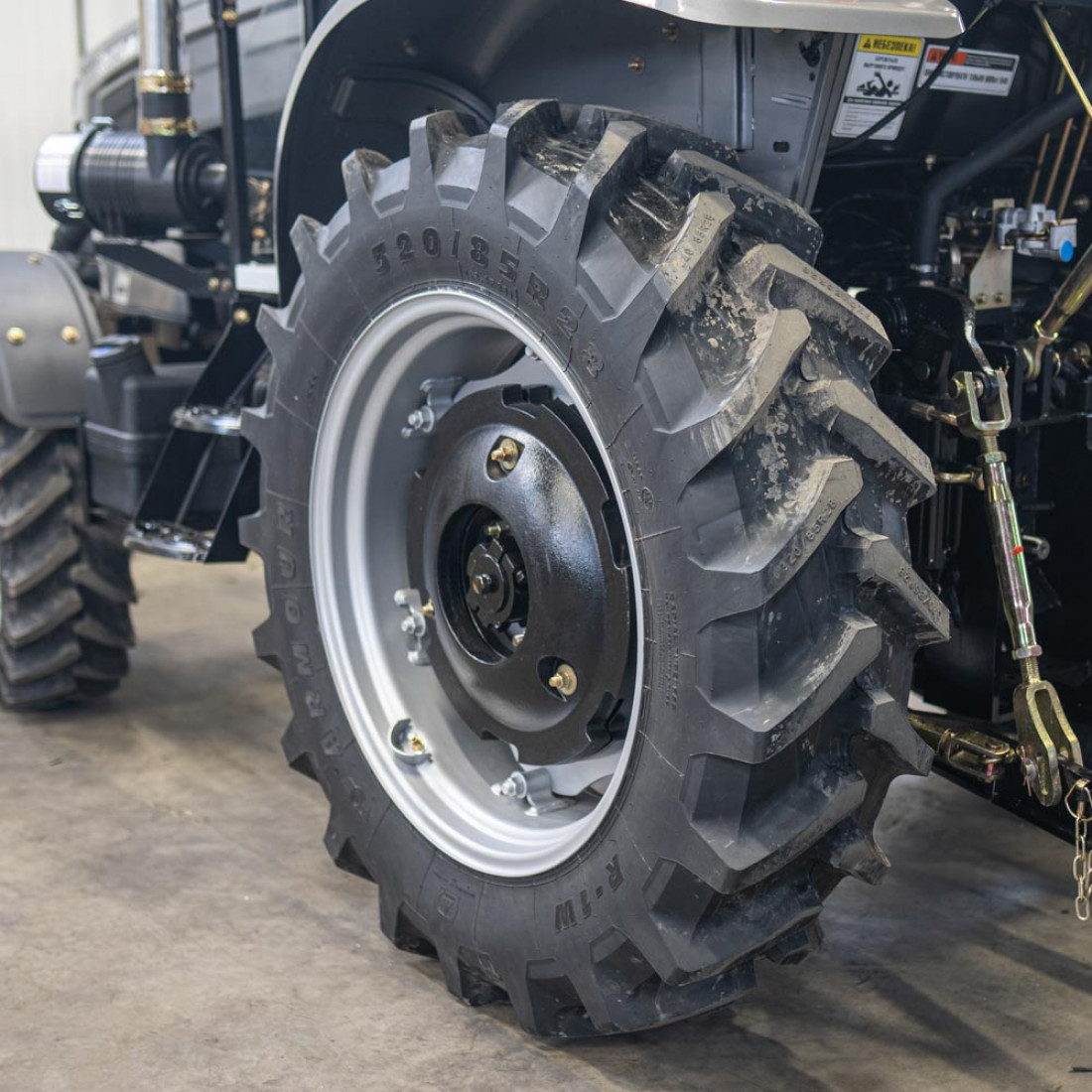 Шасси типа TE, в отличии от TY, позволяет использовать колеса большего размера - задние 12.4-28 и передние 8.3-20. Без риска для поломки трактора. Визуально КПП имеет больше размер, мощнее полуоси. Не нужно брать штангенциркуль, чтобы понять что шестерни и другие рабочие элементы значительно больше и крепче, чем используется в КПП класса TY.