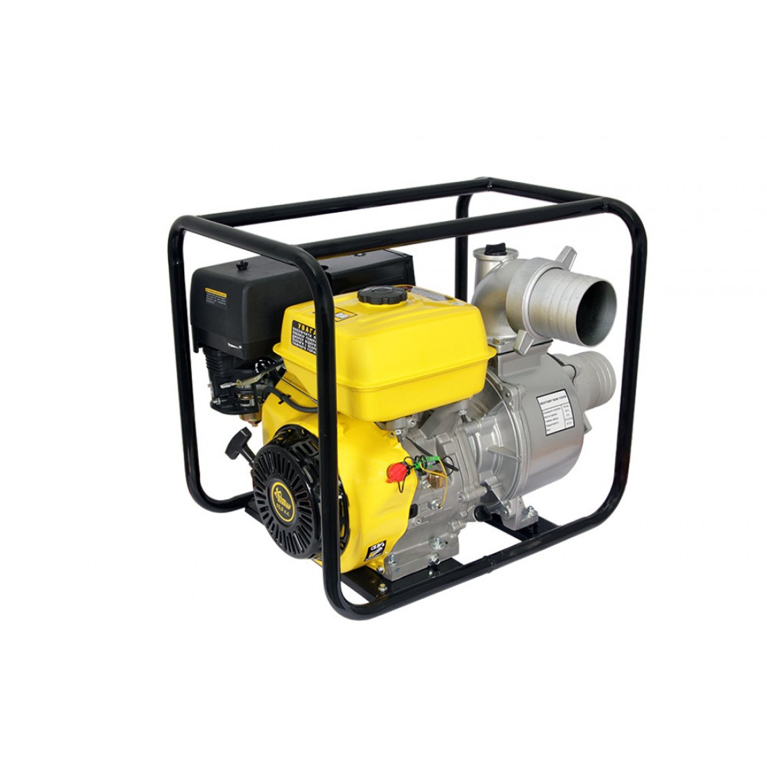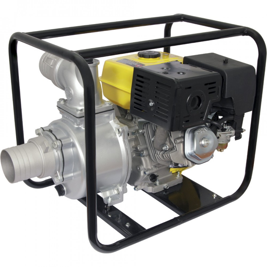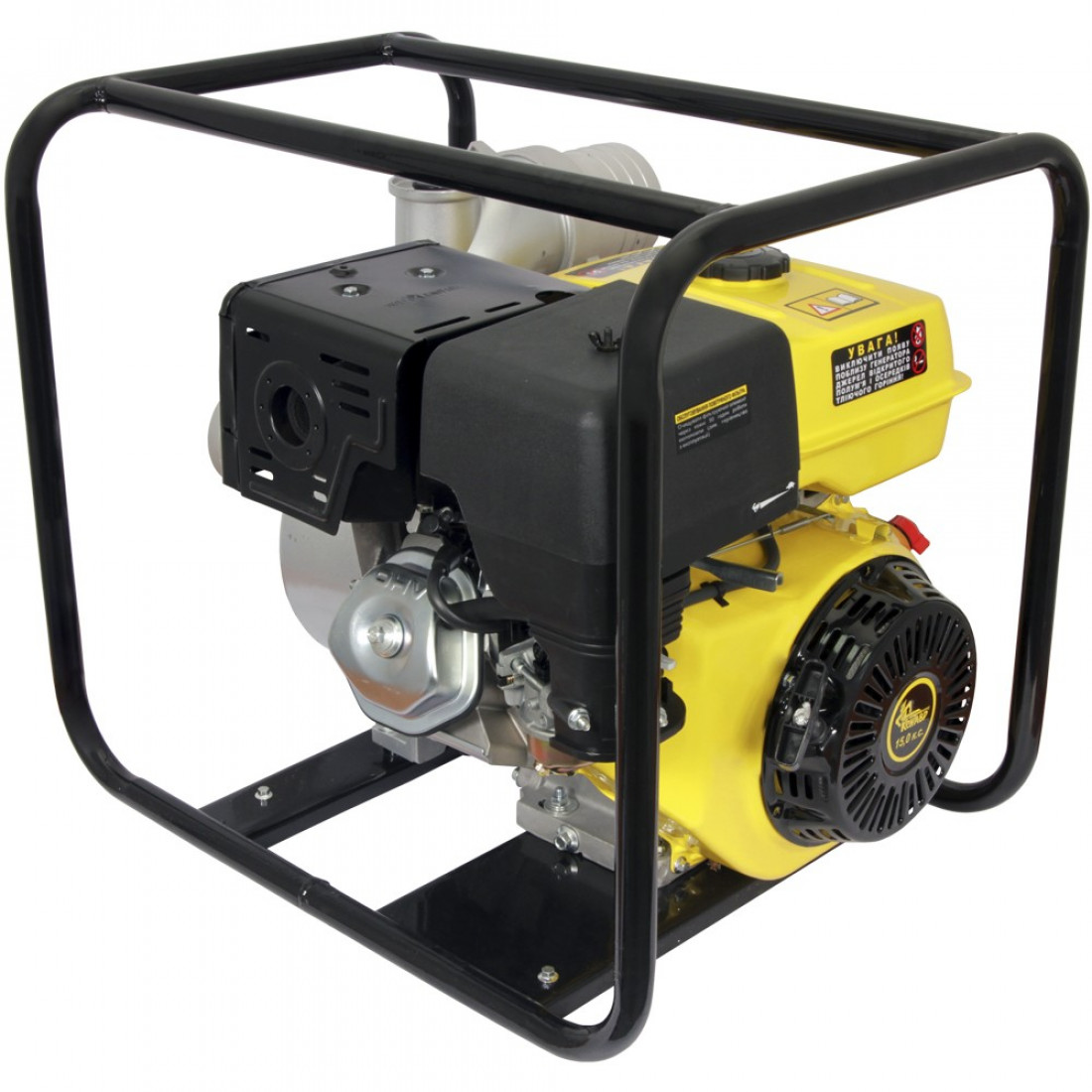 В мото-помпе стоит 4 тактный мотор на 13 л.с., довольно большая мощность поэтому обеспечивает перекачку около 100 метров кубических в час. Охлаждается воздухом, но активной системой нагнетания. Что б не забить цилиндр надо что б максимально по размеру частицы грязи были до 6 мм. В остальном характеристики стандартны — 7 метров глубина откуда он может поднять воду и 20 метров высота подачи.