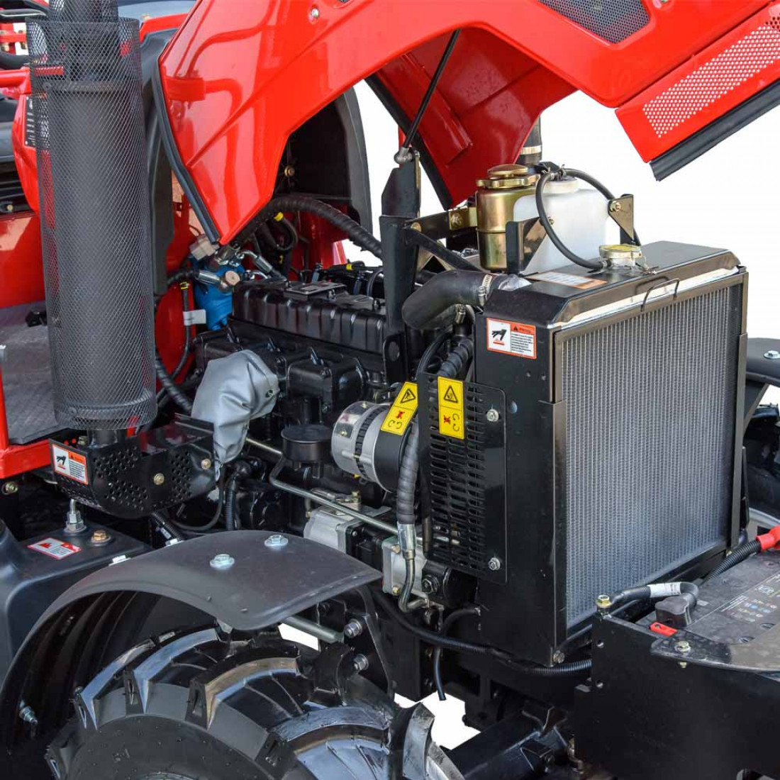 Современный полноприводный трактор Hanwo 504U оснащен 50-сильным дизельным двигателем объемом 3,170 л, механической трансмиссией с формулой переключения (4+2) × 2 и отдельной реверсивной коробкой, двухдисковым сцеплением, мощной навеской с 4 гидровыходами, двухскоростным ВОМ 540/1000 об/мин и гидрообъемным рулевым управлением с отдельным баком.