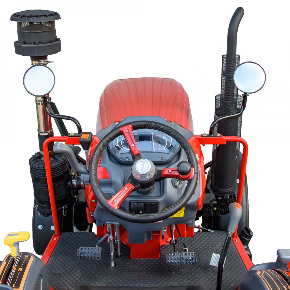 - Маневренность: гидрообъемное управление и раздельные тормоза позволяют легко разворачивать трактор на малых площадях.