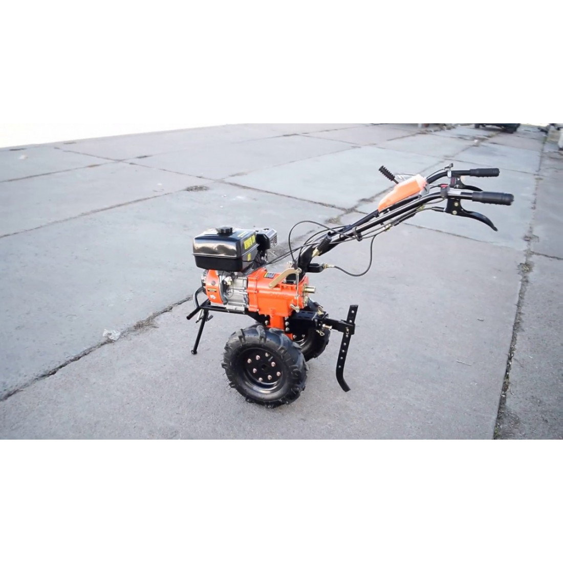 Коробка передач мотоблока имеет две передние и одну заднюю передачу, удобное и плавное переключение между которыми производится многодисковым мокрым сцеплением в масляной ванне. Шестеренчатый редуктор с цепным приводом позволяет эффективно и надежно передавать крутящий момент на ось мотоблока и воплощать его в тяговую силу при помощи пневматических колёс 4-8" с шевронным рисунком протектора.