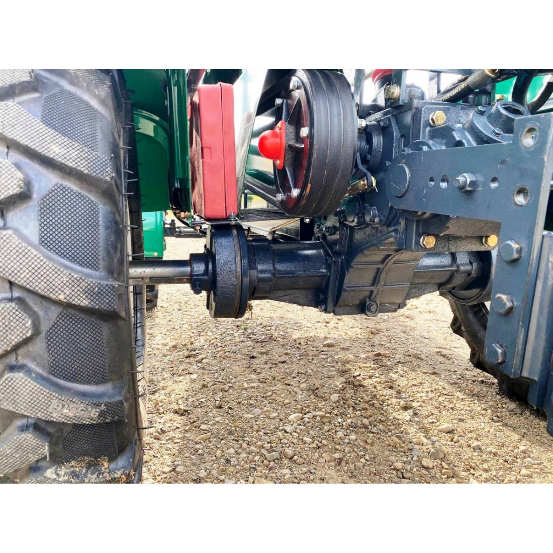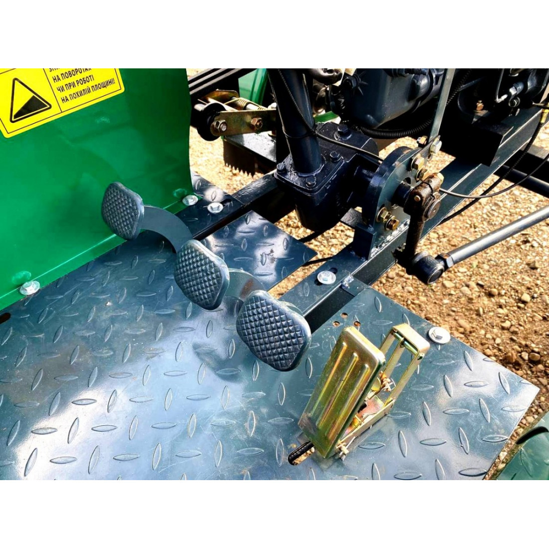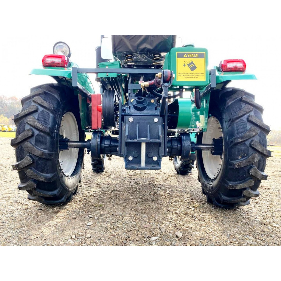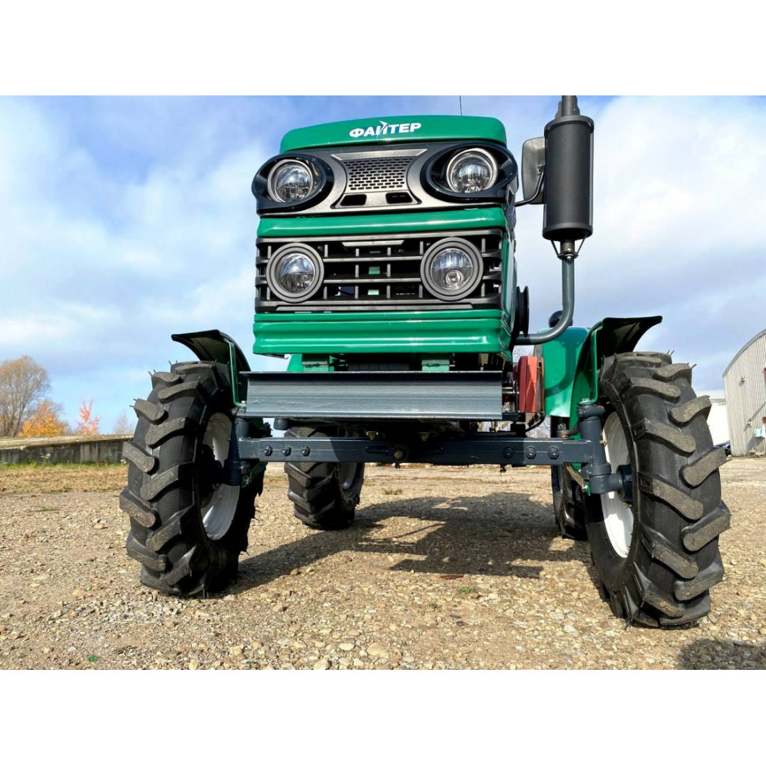 Трансмиссия мототрактора Файтер Т20 LUX спроектирована на базе существующей мотоблочной КПП, оснащена дифференциалом и блокировкой полуосей. Также имеет восемь скоростей. Шесть передач вперед и две скорости назад. Такое большое количество позволяет оператору использовать практически любое как навесное, так и прицепное оборудование как с мотоблока, так и с минитрактора. Мототрактор Файтер Т20 LUX имеет превосходную проходимость за счет современного и надежного дифференциала, а также больших пневматических передних и задних колес. Ни для кого не секрет что от типа дифференциала и его качества зависит удобство использования техники и ее долговечность. Задняя резина с размером 9.50х16 с шевронным рисунком протектора и передняя размером 6.00-12 помогают мототрактору преодолевать трудные и болотистые участки дорог. Трансмиссия работает при помощи дифференциала (гаечного) с принудительной блокировкой дифференциала. Включение блокировки осуществляется механически специальным рычагом на КПП. Этот тип дифференциала является самым популярным и востребованным на сегодняшний день в Украине.