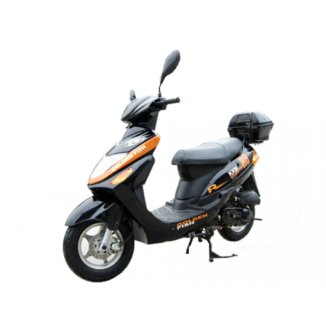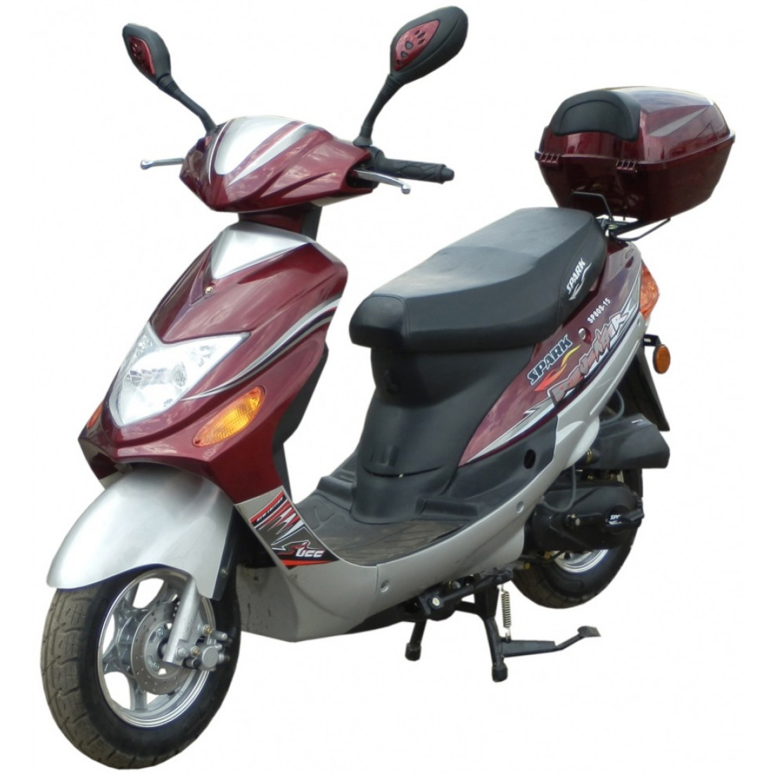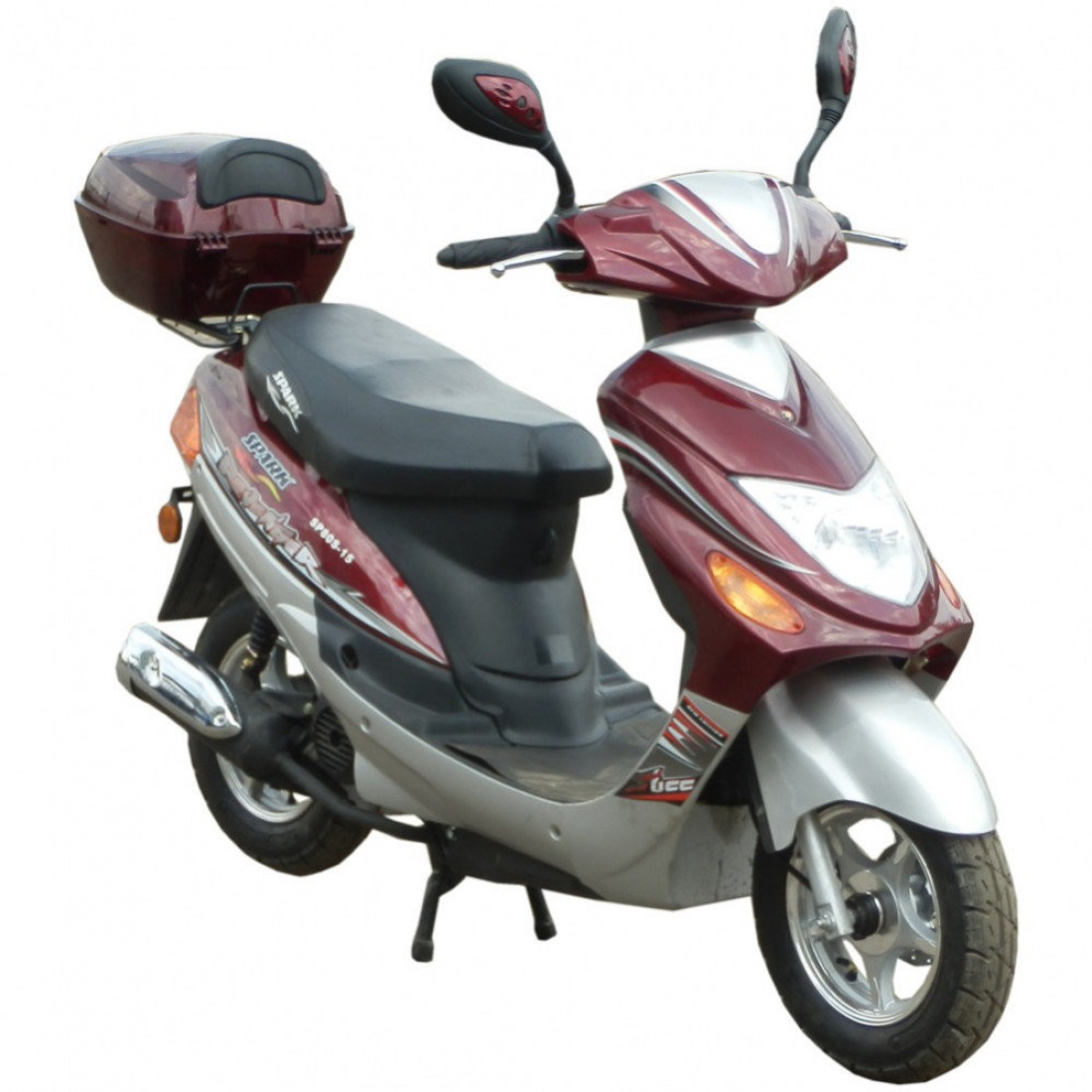 Скутер Спарк СП80С-15 имеет два задних амортизатора, передний дисковый тормоз, сигнализацию и площадку под задний кофр.