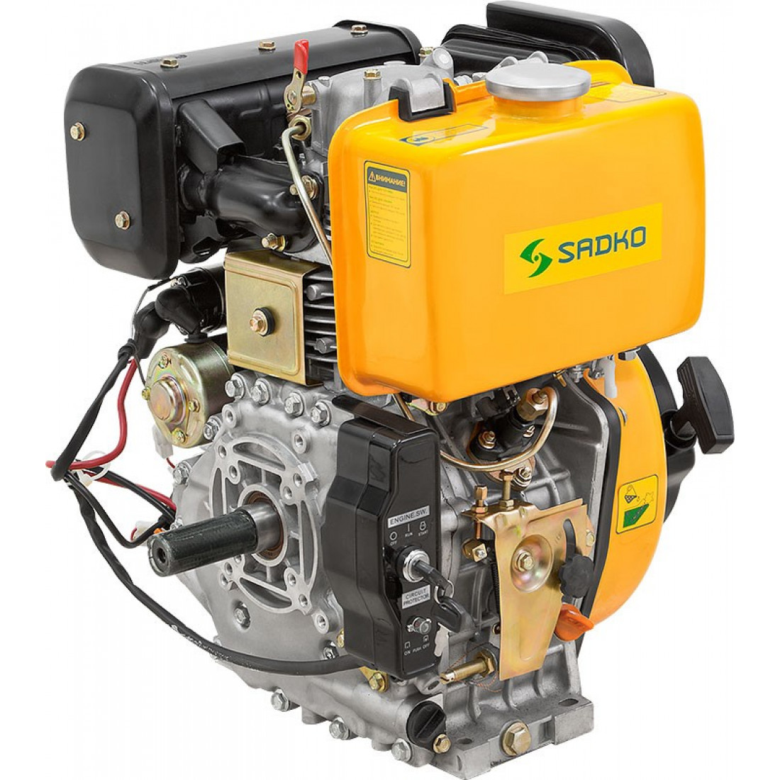 Дизельный двигатель Садко 410 ДЕ имеет мощность 9 л.с. и оснащен принудительным воздушным охлаждением, объем картера для масла составляет 1,65 литра. Топливного бака, объем которого составляет 5,5 литров, хватает примерно на 5 -6 часов работы. Запуск осуществляется как электрическим стартером, так и инерционным стартером. Двигатель оснащен функциями автоматического регулирования оборотов и автоматического стопа, а так же датчиком контроля уровня масла (аварийная защита срабатывает при низком уровне масла в двигателе). Автоматический регулятор оборотов позволяет работать двигателю с максимальной мощностью при минимальном расходе топлива.