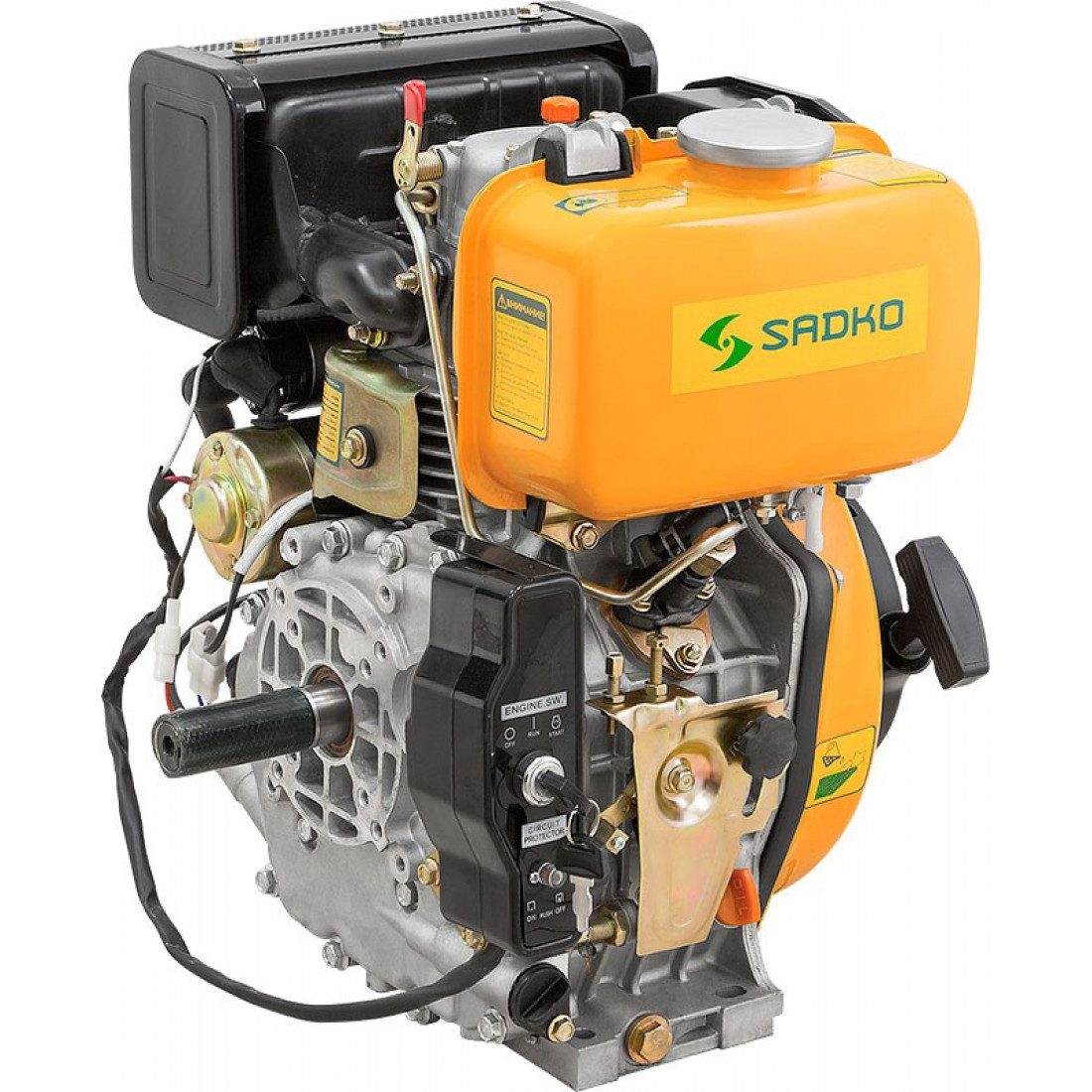 Двигатель Садко 300 Е дизельного типа имеет рабочий объем 296 см3, мощность 6 л.с. и оснащен принудительным воздушным охлаждением. Объем топливного бака составляет 3,5 литра. В качестве масла для данного двигателя рекомендуется использовать масло 10W40. Наличие электростартера значительно облегчает пуск двигателя.